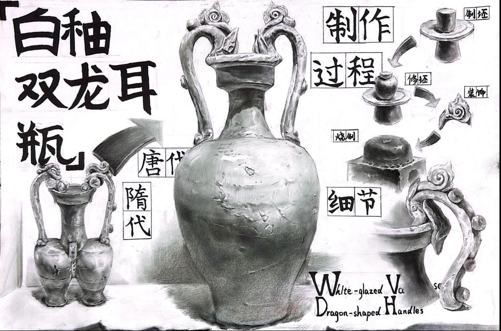 高觉泽《白釉双龙耳瓶创意素描》