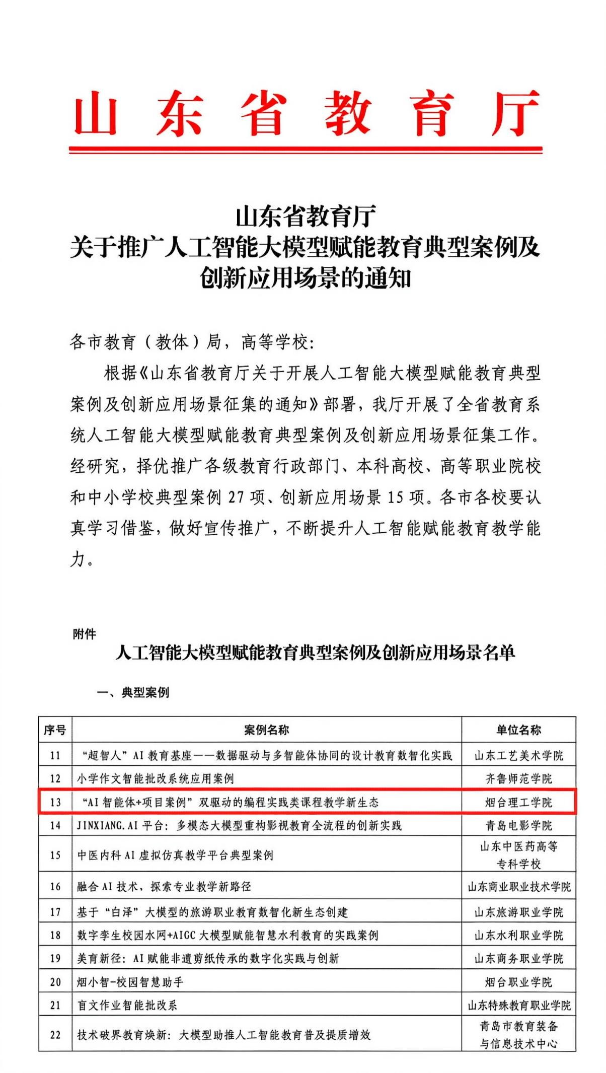 近日,山东省教育厅公布了人工智能大模型赋能教育典型案例及创新应用场景评选结果。我校迟殿委老师主持申报的案例《“AI智能体+项目案例”双驱动的编程实践类课程教学新生态》成功入选山东省人工智能大模型赋能教育典型案例及创新应用场景名单,标志着我校在人工智能赋能教育教学改革方面取得新的重要突破。